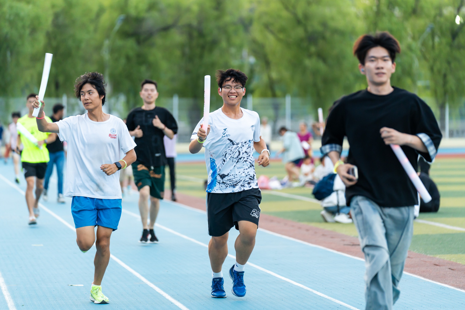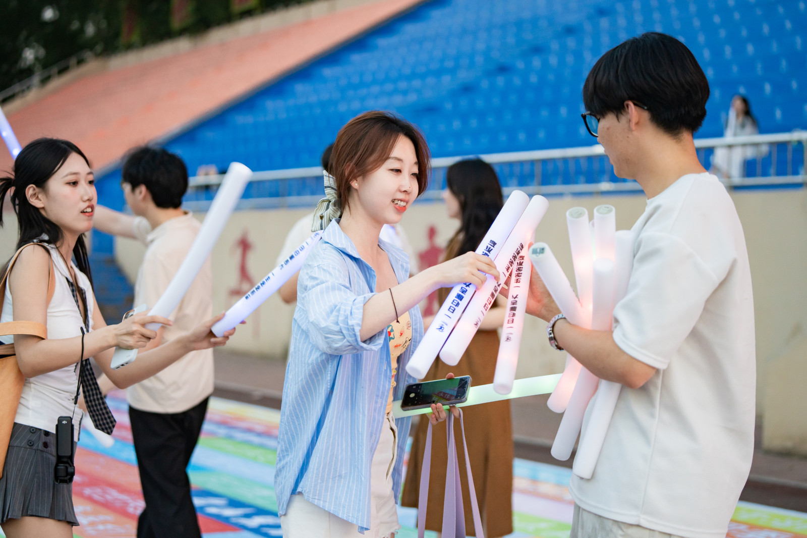 活动伊始,同学们在田径场指定点位处,领取毕业季荧光夜跑专属荧光棒与荧光手环。荧光棒在空中闪烁,如点点星光映照在荧光棒上“时光正好,青春不散场”“一日归属吉大,一生念念不忘”的文字,正如此间少年心绪,有离别的伤感、更有再会的期待。