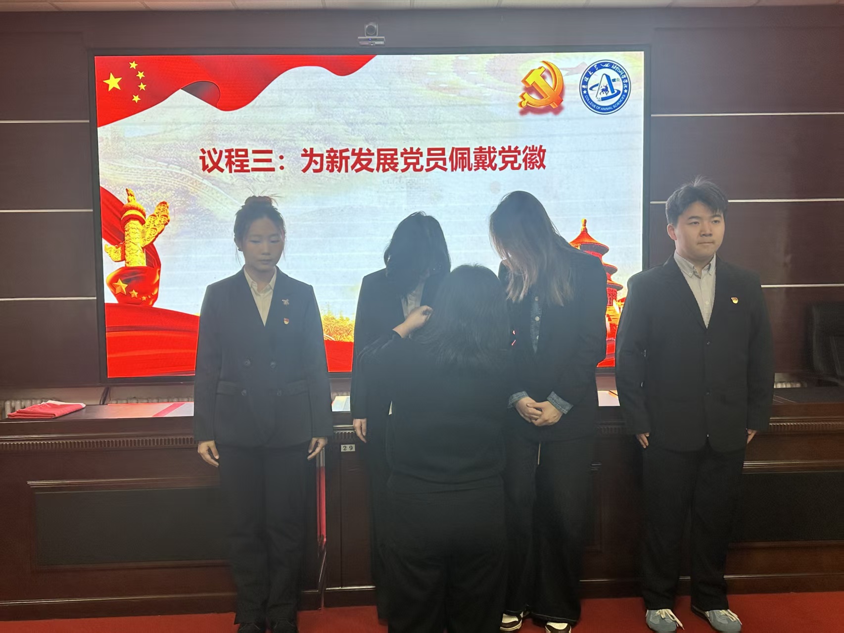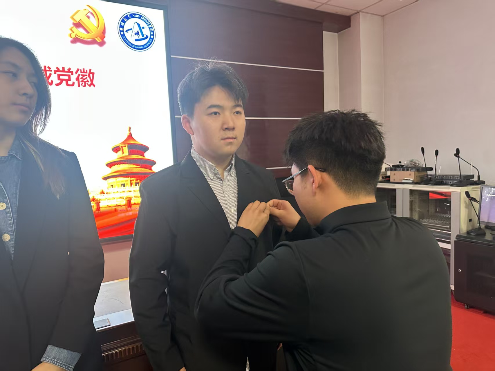 随后,肖建荣与尹暄齐同志为新发展党员佩戴党徽。熠熠党徽映照着新党员坚定的眼神,这一庄重仪式既是身份象征,更是责任传递,标志着他们正式加入中国共产党这个光荣集体,开启党员生涯新征程。
